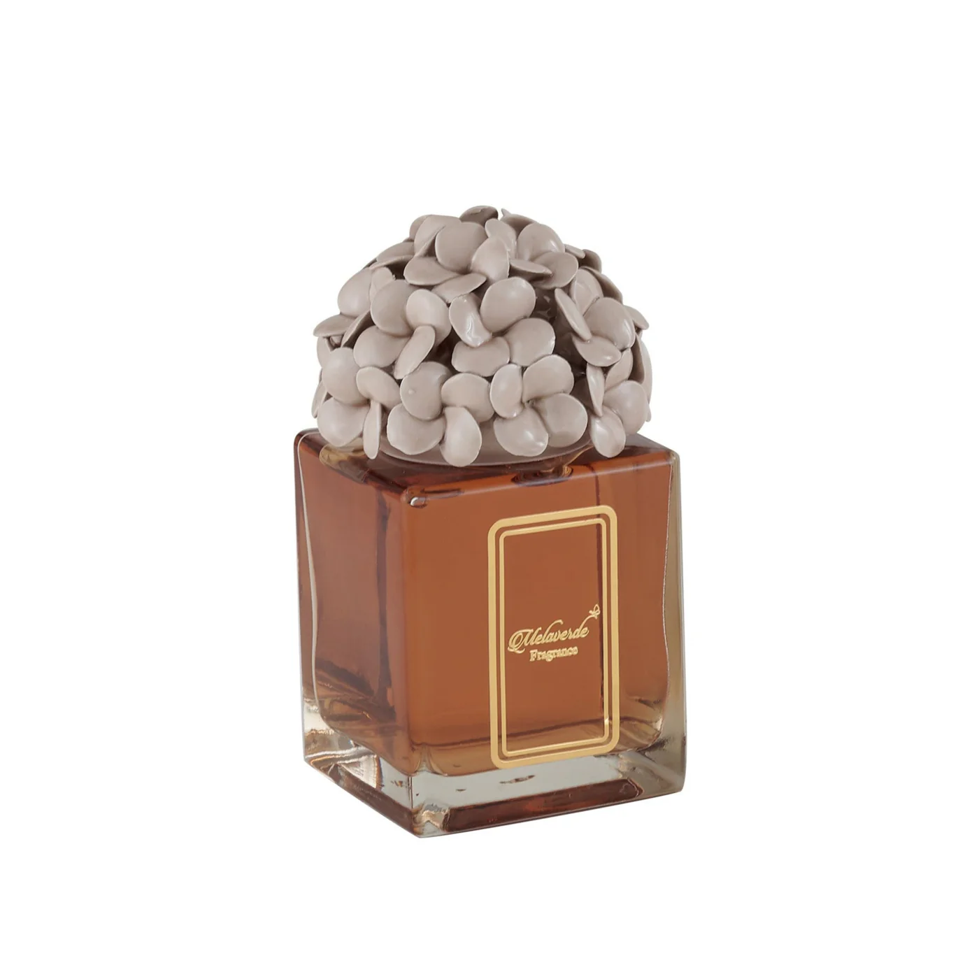 Profumatore con tappo Ortensie decorate a mano in ceramica di Capodimonte con fragranza Rouge Imperial.