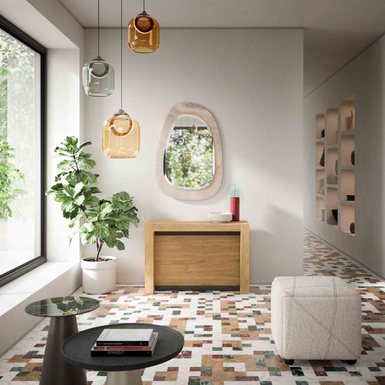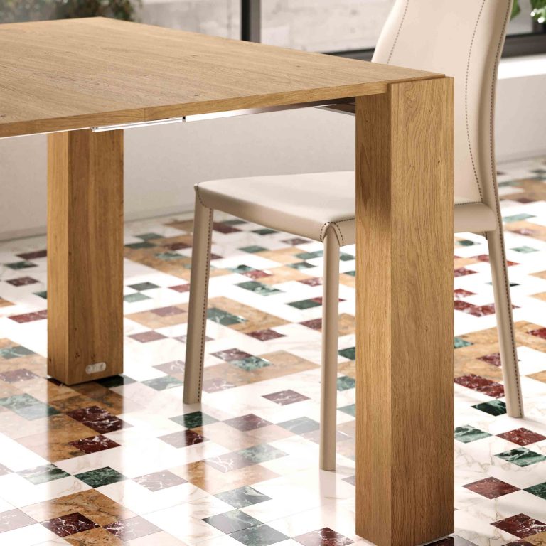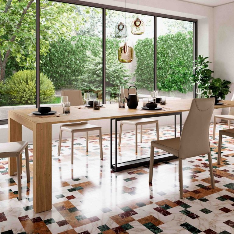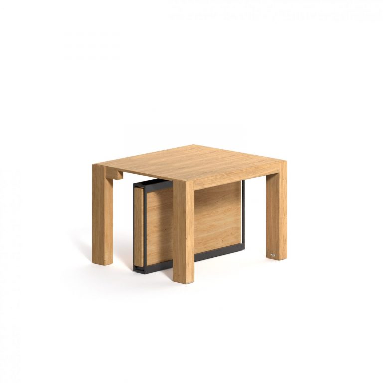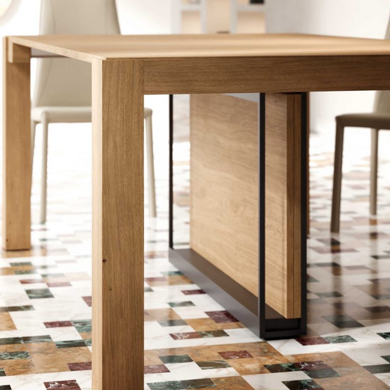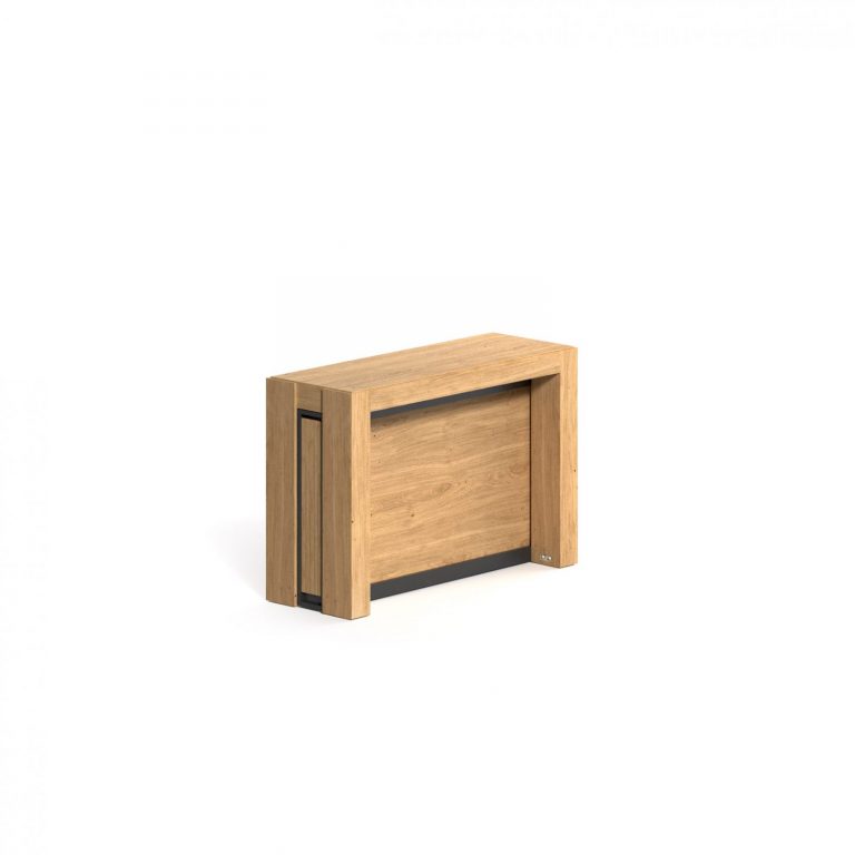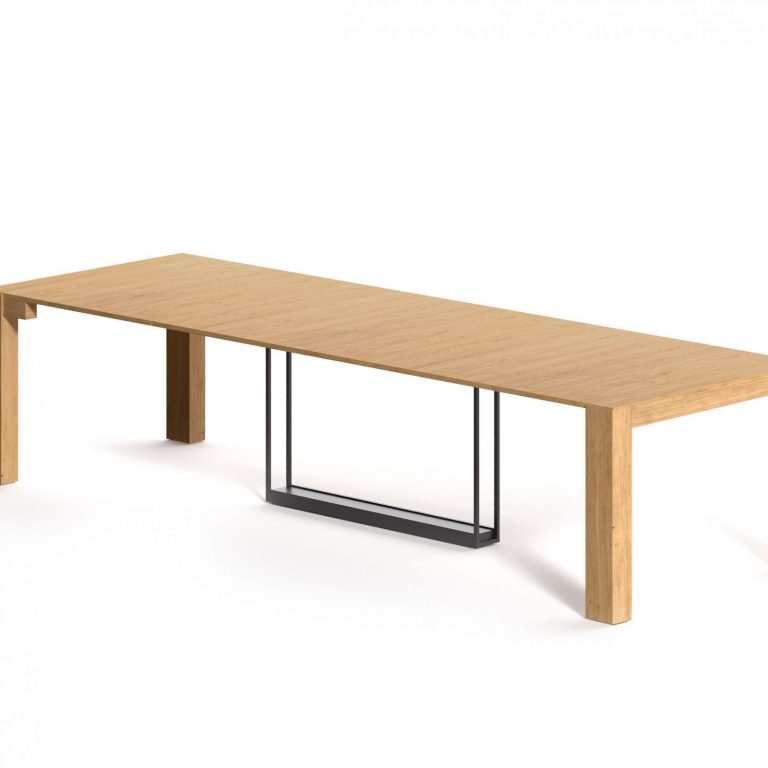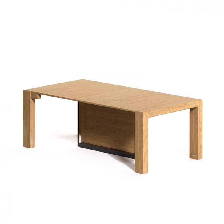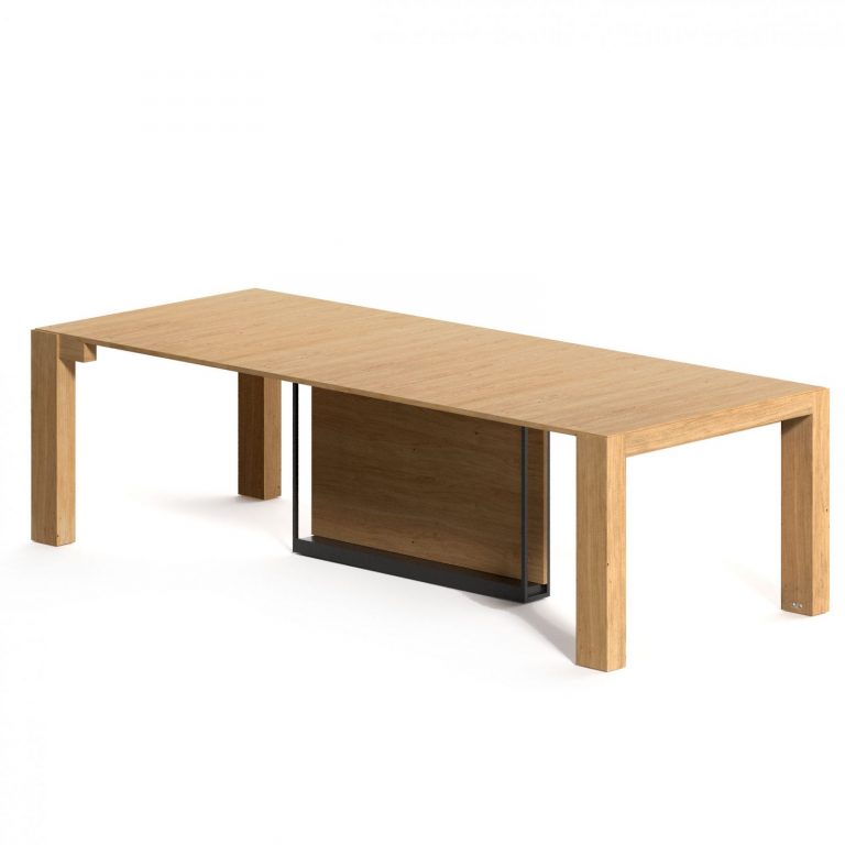 Consolle allungabile dotata di 5 prolunghe incorporate nella struttura. Meccanismo telescopico in alluminio, gamba centrale girevole per supporto a meccanismo aperto, ruote per una facile movimentazione. Sistema di bloccaggio delle gambe anteriori.