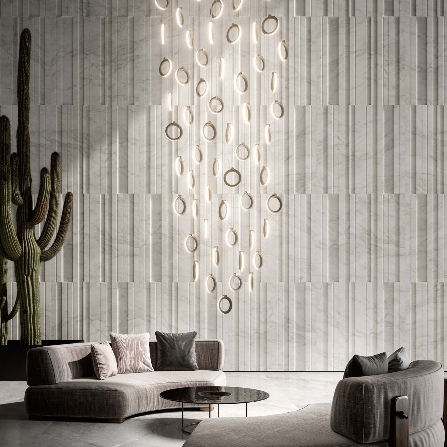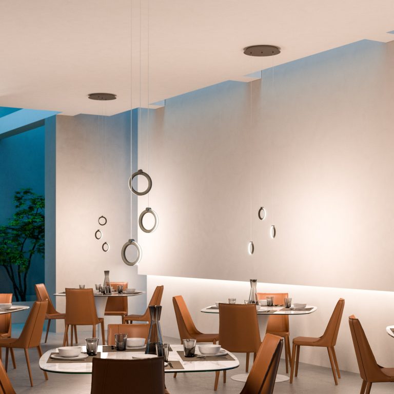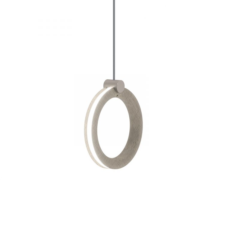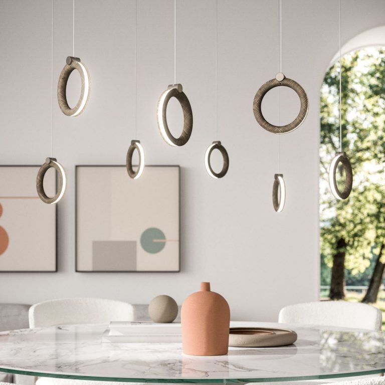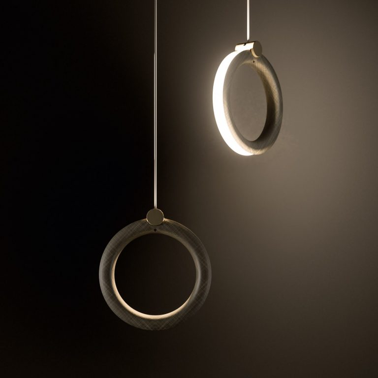 Lampade a sospensione pensate per offrire disegno e praticità, caratterizzate da un’audace luce d’accento. Al contempo decisa e delicata la loro luce si fa spazio tra le fessure dell’anello risplendendo come un diamante nella roccia, divenendo il focus principale della stanza e donando importanza ad ogni dettaglio dell’ambiente domestico.
