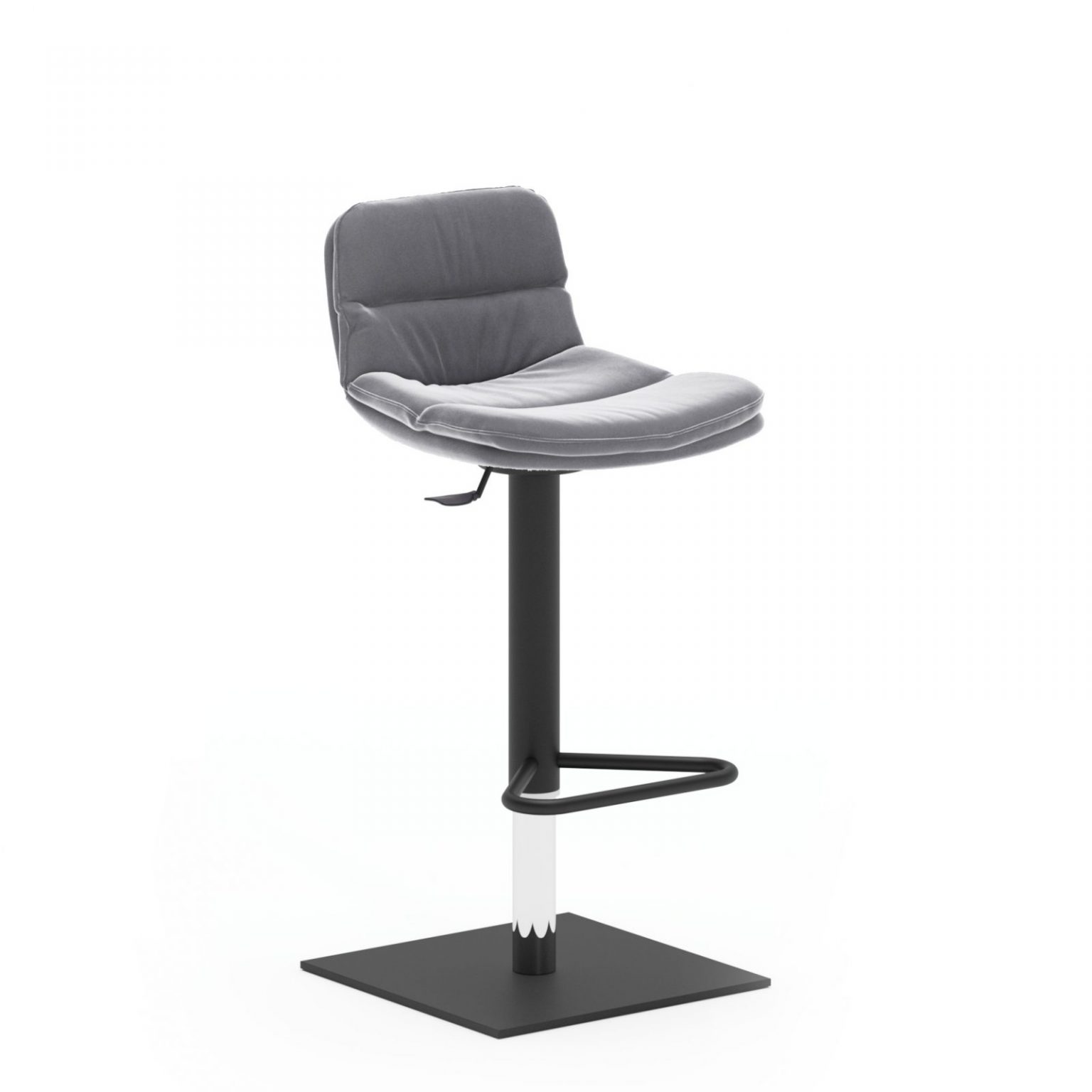 Sgabello con alzata a gas, basamento in metallo. Seduta rivestita in varie finiture.