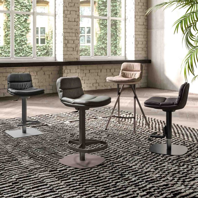 Milo, Morfeo, Morris e Marlon sono sgabelli accomunati da una seduta imbottita dall’effetto cozy e da cuciture che fanno trasparire il loro morbido rivestimento. Sono ideali per l’utilizzo in salotto o come complemento per decorare la penisola della cucina. Disponibili in una vasta gamma di colori, sono facili da abbinare, poiché capaci di donare all’ambiente una sensazione di pacata rilassatezza