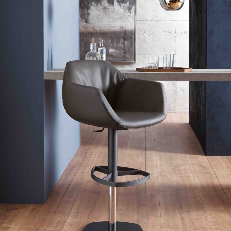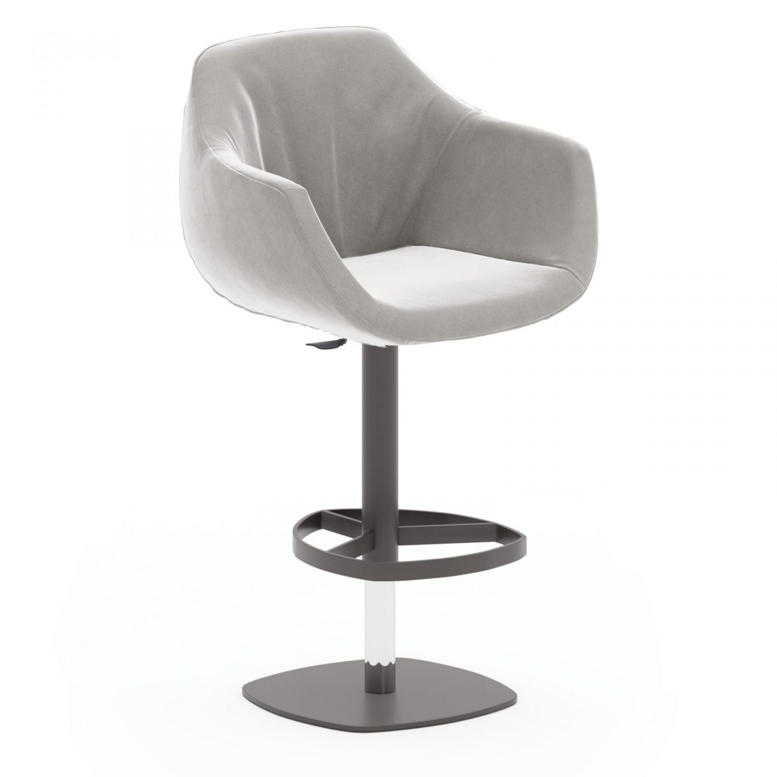 Sgabello con alzata a gas, basamento in metallo. Seduta con braccioli rivestita in varie finiture.