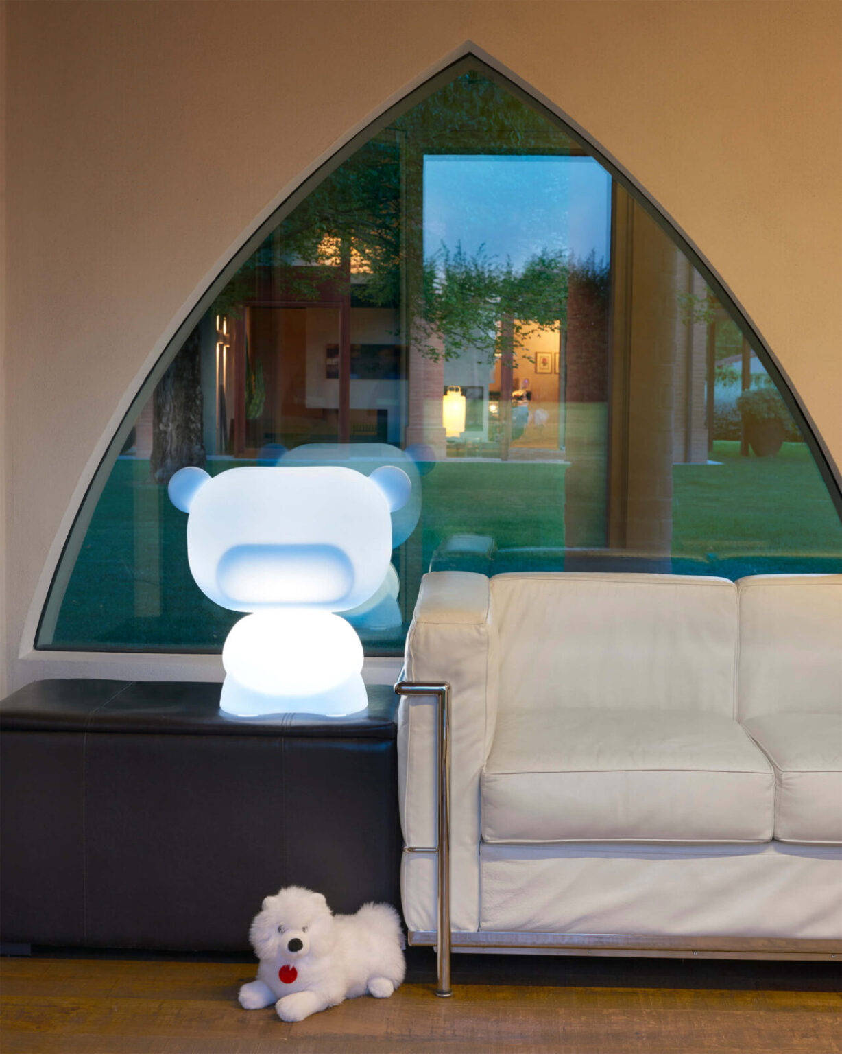 Pure è una lampada da tavolo moderna che è un evergreen dell’intera produzione di Slide SRL. Si tratta di un complemento d’arredo a forma di orsacchiotto ideato dallo studio Lab81 seguendo il filone del “Toy Movement” che si ispira appunto alle forme dei giocattoli. Un esempio è dato dal coniglietto Jumpie e dal volatile Here: potrai acquistarli per sistemarli tutti assieme nella stanza del tuo bambino rendendola divertente e luminosa.