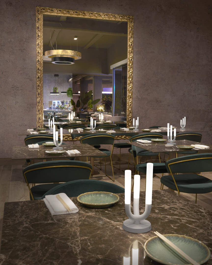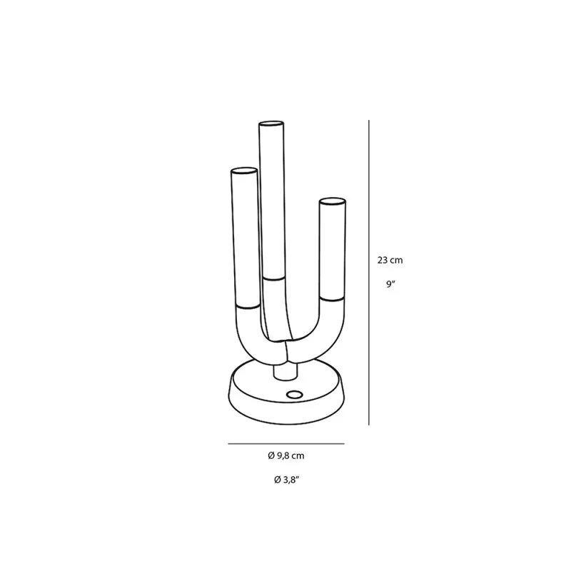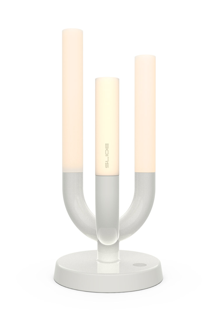 Luna è una luce romantica, fervida di emozioni che evoca scenari dal sapore classico, ispirata agli eleganti candelabri per creare in chiave contemporanea una lampada da tavolo ricaricabile che richiami l’eleganza e i tratti distintivi di questo genere di prodotto. Luna è costituita da un trittico di “candele” che accoglie tre cilindri a differente altezza, come tre candele irregolari consumate dal passare del tempo, che illuminano in modo soffuso. Il tutto costituisce una lampada contemporanea, portatile, leggera, ricaricabile e dimmerabile. Le sue alte prestazioni sono racchiuse in una base di alluminio verniciato e i tre steli a cilindro in plexiglass opaco con tre fonti di illuminazione a LED.
