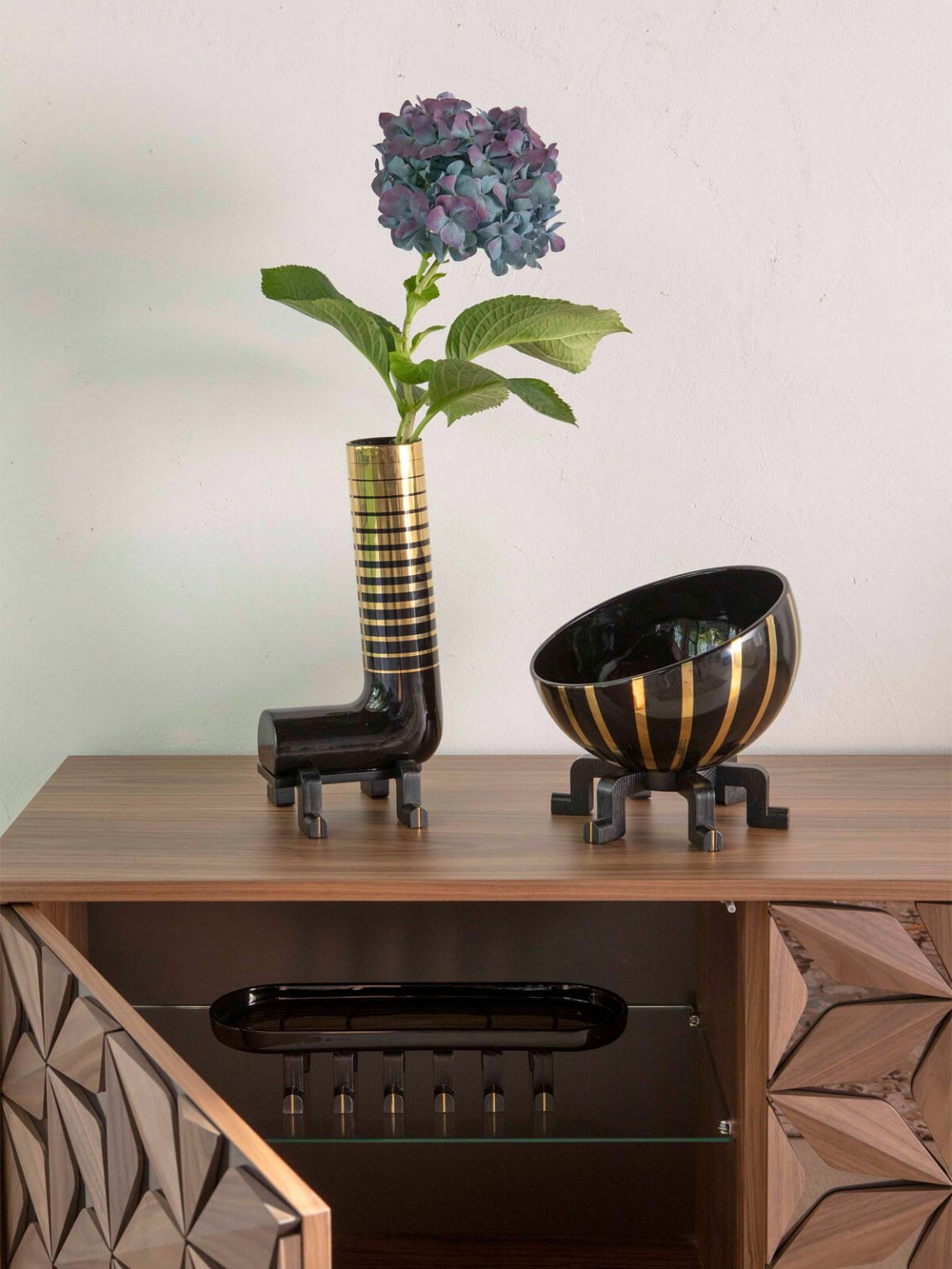 Queste giocose creature in ceramica artistica smaltata lucida con dettagli in legno massello e ottone sono disponibili con finiture bianco/nero e nero/oro zecchino.